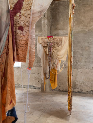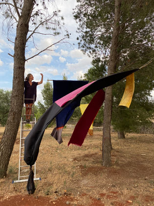 Stoffe tragen Erinnerungen – an Orte, Berührungen, ihre Geschichte. In meiner Arbeit verwebe ich Honanseide, Samt und Nessel mit alten Vorhängen aus Palazzi und Mitgift- Leinen. Sie finden eine neue Bestimmung – im Spiel mit den Naturgewalten. Zwischen Apuliens Bäumen entfalten die Stoffe ihre eigene Sprache. Der Wind reißt an den Fasern, die Sonne bleicht sie, der Boden färbt sie ein. Sie fransen aus, werden zerschlissen – und schöner. Ich lasse geschehen und greife ein, setze Akzente, füge hinzu, halte den Moment fest. Jede Narbe, jede Spur erzählt vom Wirken der Elemente.